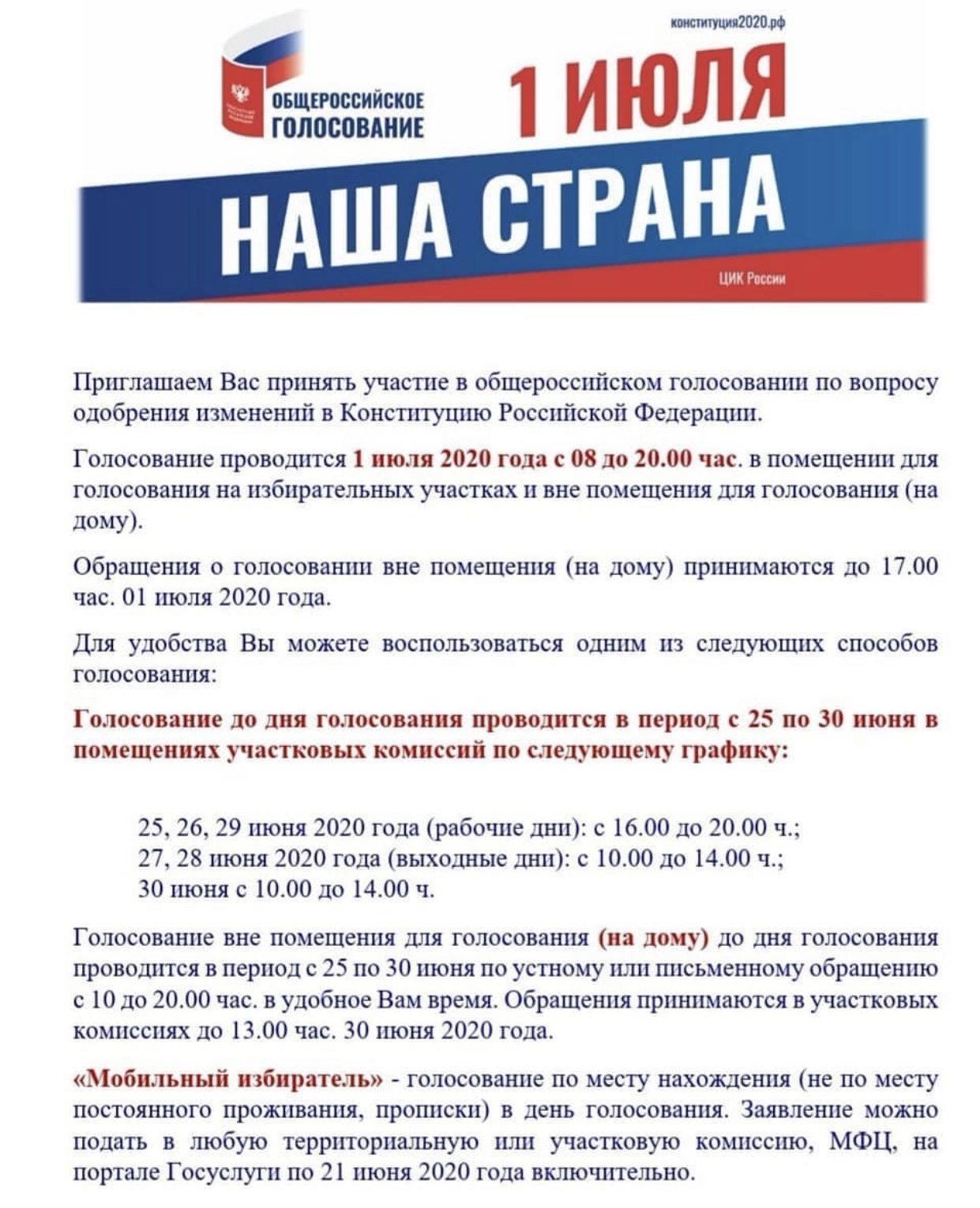 1 июля состоится Общероссийское голосование по поправкам к Конституции России. Ознакомиться с предлагаемыми поправками и получить информацию о процедуре голосования можно здесь.