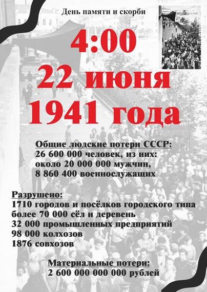 Этот день напоминает о всех погибших в боях, замученных в фашистской неволе, умерших в тылу от голода и лишений. Рано утром 22 июня 1941 года без объявления войны фашистская Германия напала на Советский Союз, нанеся массированный удар по военным и стратегическим объектам и многим городам на глубину до 250-300 километров от государственной границы.