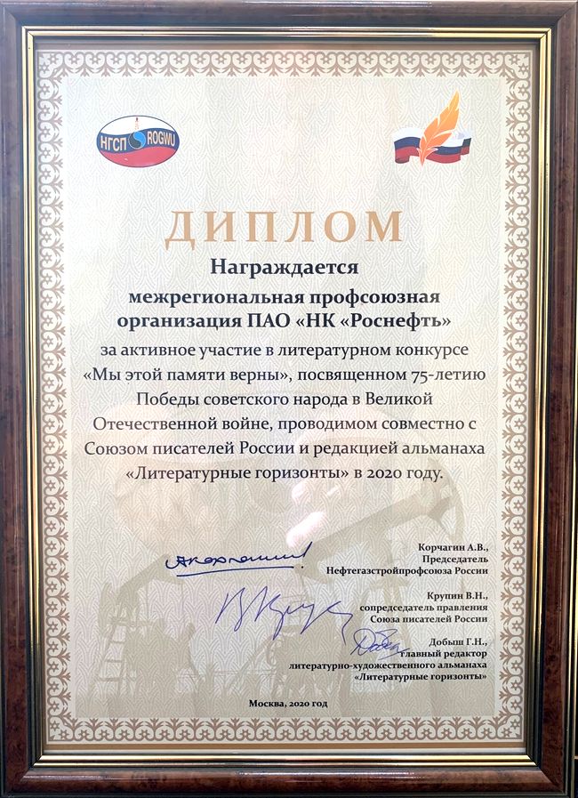 Сотрудники предприятий Компании «Роснефть» стали дипломантами литературного конкурса «Мы этой памяти верны», посвященного 75-летию Победы советского народа в Великой Отечественной войне. Конкурс проводил Нефтегазстройпрофсоюз России совместно с Союзом писателей России и редакцией альманаха «Литературные горизонты».