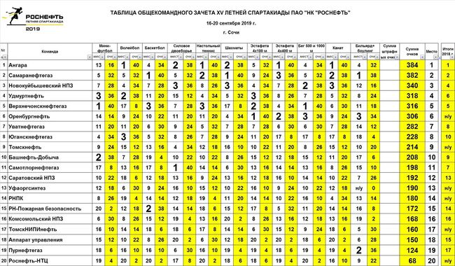 В Сочи завершились финальные игры ХV Летней Спартакиады «Роснефти». В соревнованиях, проходивших на олимпийских объектах Сочи, участвовали 800 спортсменов из 19 команд Дочерних обществ Роснефти и команда ее Центрального аппарата управления. Все они приехали в Сочи, чтобы побороться за победу в 10 видах спорта.