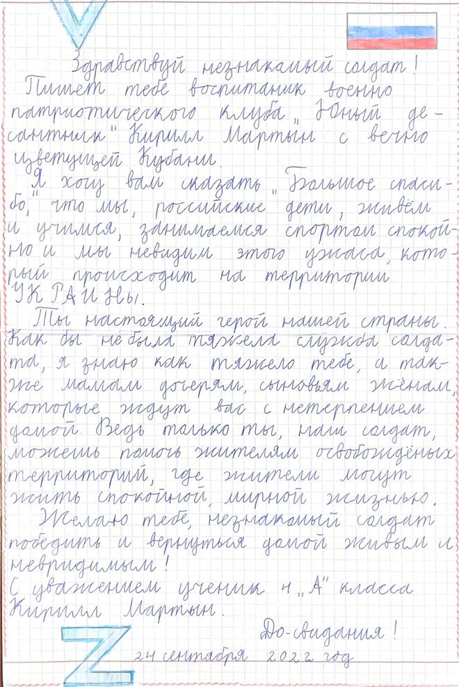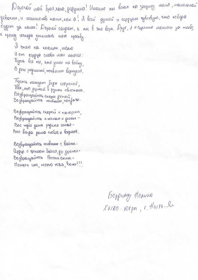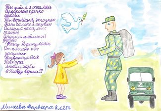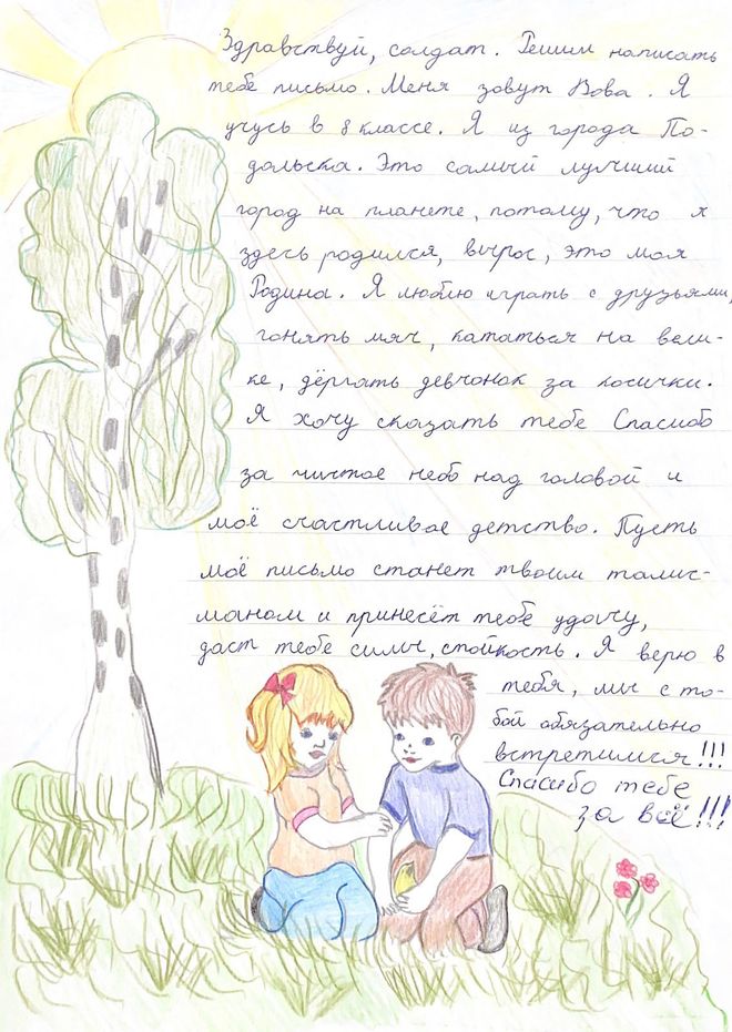 Ребята нарисовали в поддержку военнослужащим добрые и трогательные рисунки с пожеланиями: «Скорее возвращайся домой!», «Мы тебя ждем!», «Мы верим в тебя!», написали письма, сделали своими руками открытки.