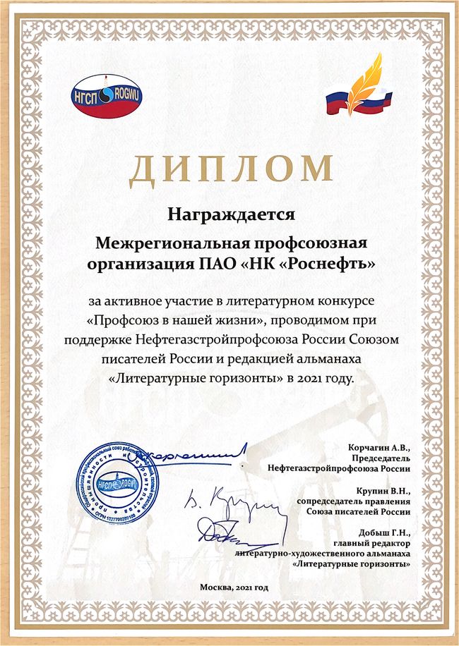 18 сотрудников предприятий Компании «Роснефть» стали победителями и дипломантами литературного конкурса «Профсоюз в нашей жизни», который проводил Нефтегазстройпрофсоюз России совместно с Союзом писателей России и редакцией альманаха «Литературные горизонты».