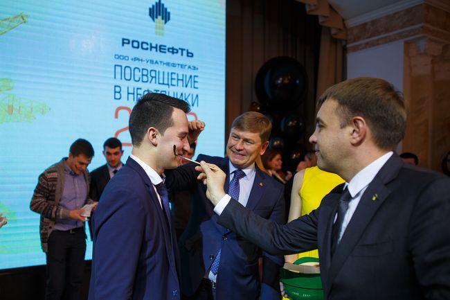 Далее молодые нефтяники произнесли торжественную клятву, а затем руководители исполнили важный для каждого нефтяника обряд посвящения – «помазали» лица ребят нефтью месторождений «РН-Уватнефтегаза».