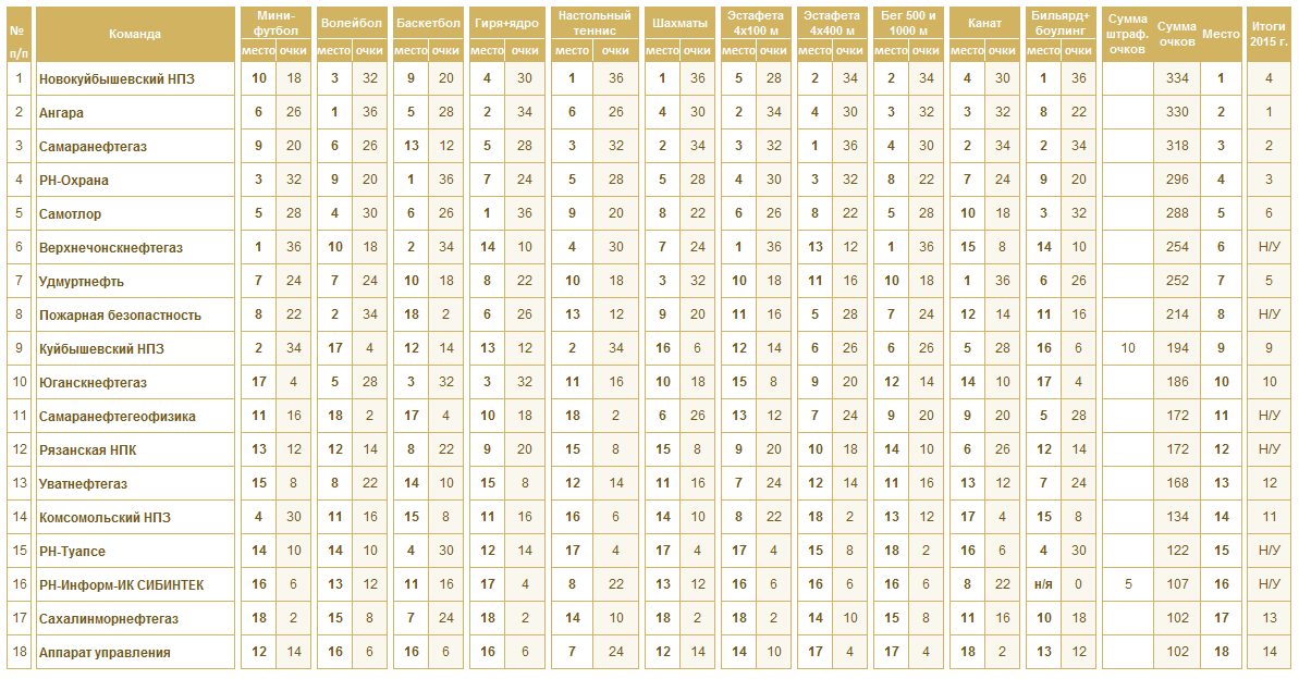 По результатам общекомандного зачета победительницей Спартакиады стала сборная команда Новокуйбышевского НПЗ, всего лишь 4 балла в общем зачете им уступила сборная команда «Ангара». Бронзовым призером Летней Спартакиады стала команда Самаранефтегаза.