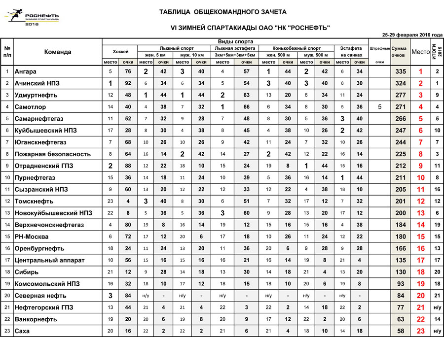 Победительницей VI Зимней Спартакиады стала сборная команда «Ангара», следом, с небольшим отрывом – прошлогодний лидер - сборная Ачинского НПЗ, бронзовый призер – команда «Удмуртнефти» (в прошлом году она была лишь девятой в общем зачете).