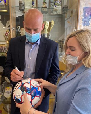 Памятный мяч для экспозиции подписал председатель профсоюзной организации предприятия Андрей Сизых.