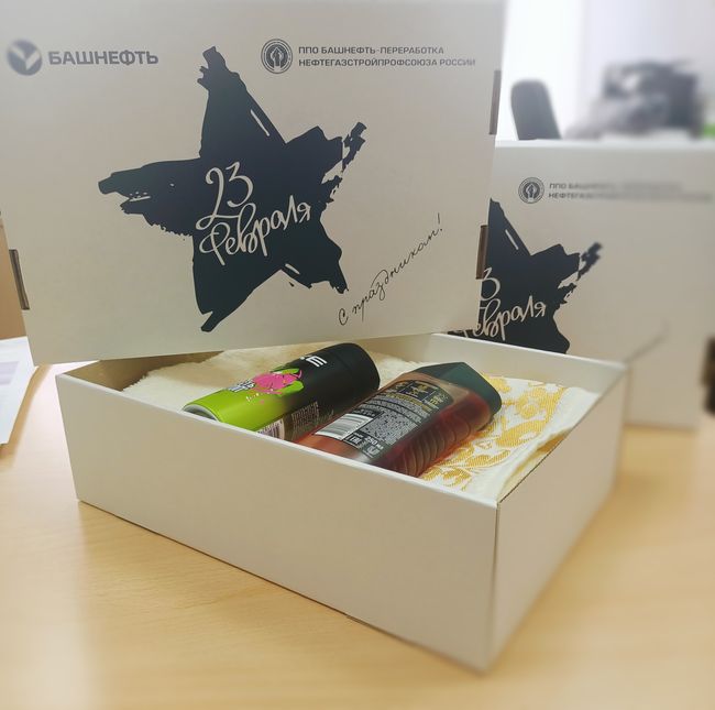 Специально к празднику профсоюз и филиалы подготовили для мужчин памятные и полезные подарки - индивидуальные мужские косметические наборы. Около 7 тысяч таких подарков были вручены мужчинам - сотрудникам филиалов АНК «Башнефть»: «Башнефть-Уфанефтехим», «Башнефть-Новойл», «Башнефть-УНПЗ» через председателей цеховых профсоюзных организаций.