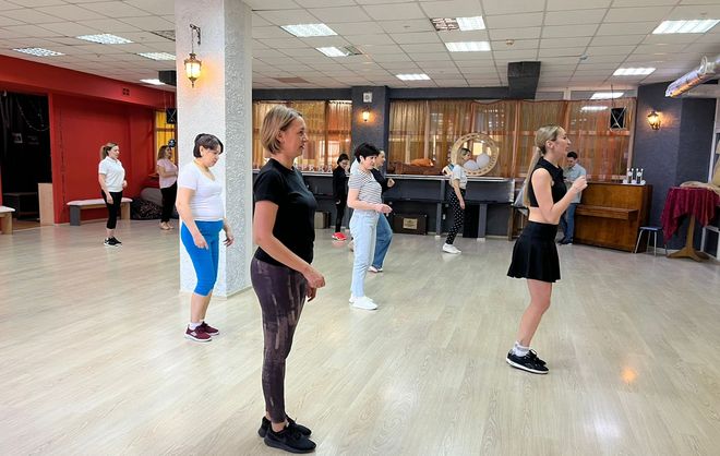 Обычно при попытке зеркально повторить движения за тренером - возникает путаница. Поэтому, чтобы упростить задачу, преподаватель показывает «па» спиной к участникам мастер-класса, перед зеркалом – чтобы можно было работать синхронно.