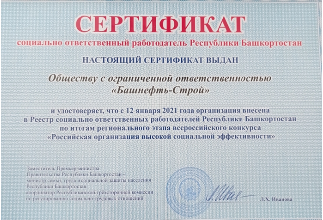 В торжественном награждении участвовали Председатель профсоюзной организации ООО «Башнефть-Строй» Ильгиз Камалетдинов и начальник управления по социальным программам предприятия Ирина Марьина: им были вручены дипломы за призовые места и Сертификат «Социально-ответственный работодатель Республики Башкортостан», удостоверяющий что с 12 января 2021 года организация внесена в Реестр социально-ответственных работодателей РБ.