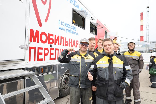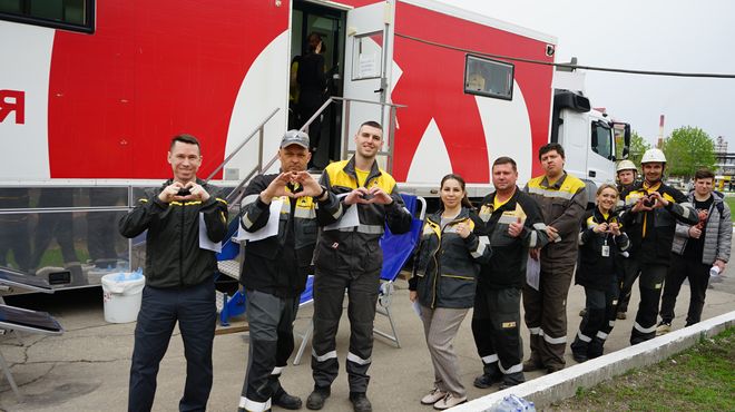 Сегодня ранним утром Куйбышевский НПЗ встречал передвижной пункт забора крови у проходной. В 8-30 на заводе начался День донора.