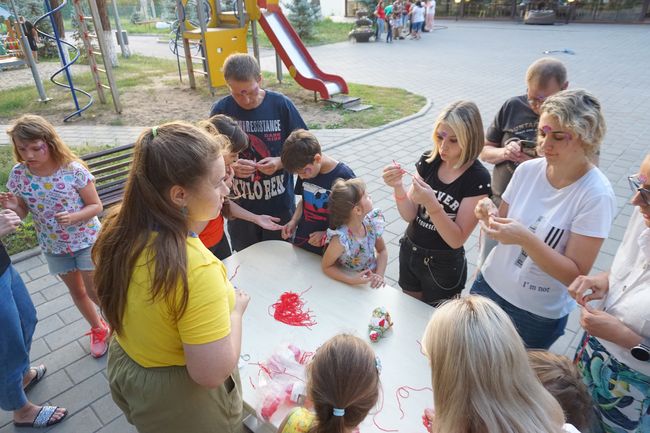 Праздник организовали в стиле древнерусской ремесленной ярмарки, где дети вместе с родителями мастерили обереги - фенечки и куклы, метали дротики в надувные шары, ковали монеты, изготавливали магнитики и, конечно, плели венки из ромашек...