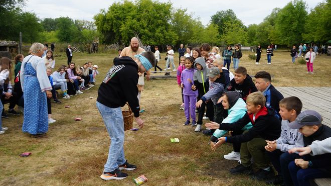 На поляне дети смогли примерить на себя одежду из звериных шкур, научиться стрелять из лука, рисовать на ткани…