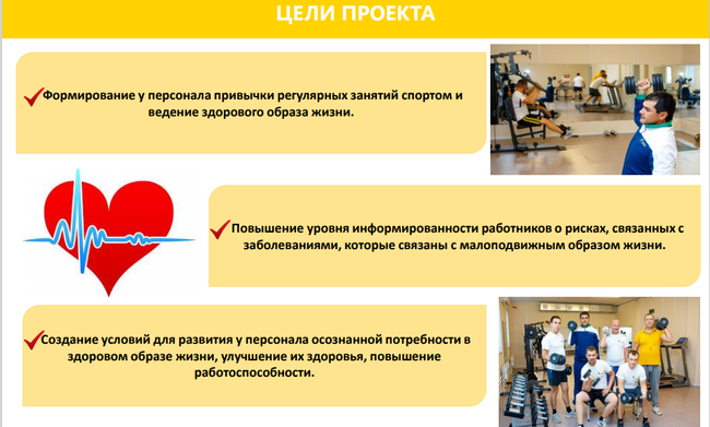 Целями проекта его авторы поставили: формирование привычки регулярных занятий спортом и ведение здорового образа жизни, повышение информированности о рисках малоподвижного образа жизни, создание условий для развития у персонала осознанной потребности в здоровом образе жизни, улучшение их здоровья и повышение работоспособности.