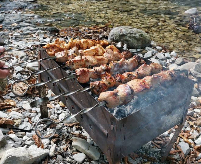 Успешный финал маршрута коллеги-туристы, бодрые и наполненные новыми впечатлениями, отпраздновали вкусным шашлыком. Отличная традиция — за походным ужином поделиться эмоциями друг с другом, отдохнуть и спланировать новые поездки!