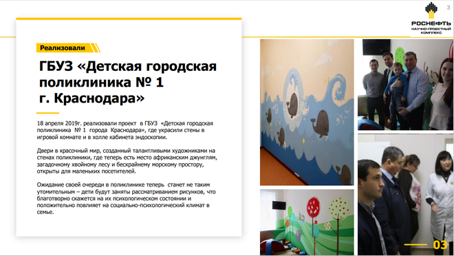 Посещение поликлиники или больницы - всегда стресс для детей. Им часто приходится вместе с родителями сидеть в холле в ожидании приёма, рассматривая плакаты слышать плач других детей. Чтобы создать в детских лечебных учреждениях благоприятную психологическую обстановку, профактив «НК «Роснефть» - НТЦ» решил реализовать социально-ориентированную акцию по росписи стен в детских лечебных учреждениях Краснодара.
