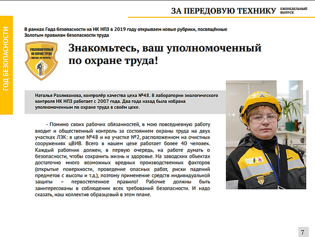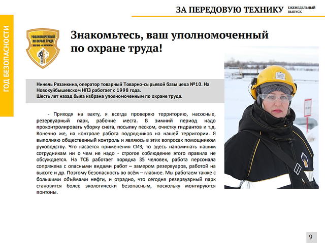 Профсоюзная организация Новокуйбышевского НПЗ совместно с отделом по взаимодействию со СМИ и общественностью в объявленный на предприятии «Год безопасности» ввели новую рубрику «Знакомьтесь, ваш уполномоченный по охране труда» в еженедельной заводской электронной газете «За передовую технику».