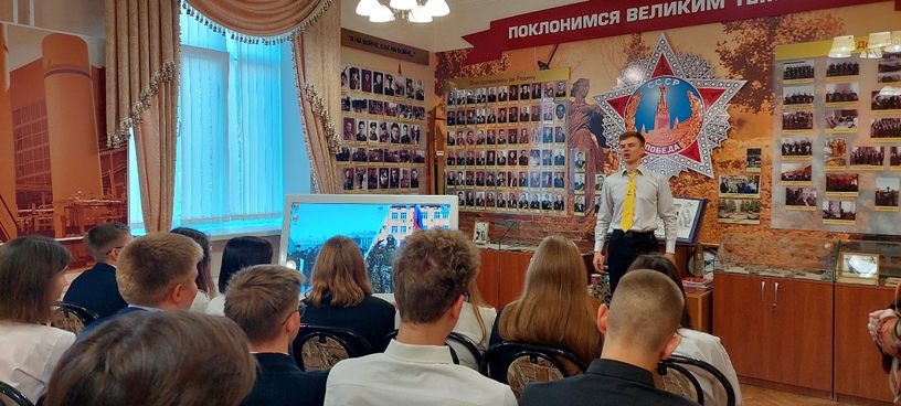 Следующей группой стали ученики «Роснефть»-класса школы №7. Встреча была посвящена важному историческому событию – военному параду 7 ноября 1941 года в г. Куйбышеве. Методист зала Наталья Швец рассказала ребятам о том, как подходила подготовка к параду, сколько расчетов принимало участие и кто стоял на трибуне. Школьники посмотрели кадры исторической кинохроники и современные кадры Парада Памяти, посвященного Параду 7 ноября 1941 года. Одним из свидетелей парада 1941 года был Николай Михайлович Журавлёв, участник ВОВ, ветеран НК НПЗ.
