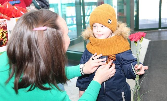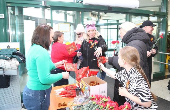 С утра в центральном офисе «РН-Пурнефтегаза» всем желающим выдали георгиевские ленточки, цветы.