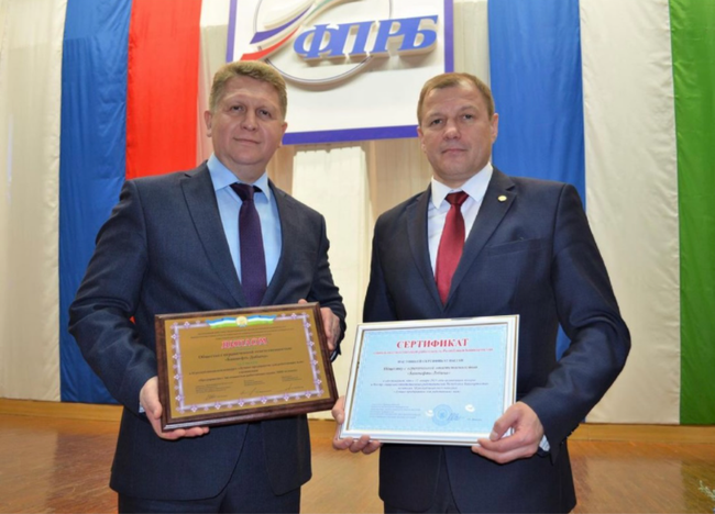 Диплом конкурса представители предприятия – заместитель Генерального директора по персоналу и социальным программам Владимир Шленев и председатель Профсоюзной организации Михаил Сабуров – получили на торжественной церемонии вручения наград предприятиям-победителям регионального этапа Всероссийского и Республиканского конкурсов, нацеленных на развитие социального партнерства.