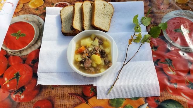 Главный конкурс туристического слёта – приготовить за 2 часа блюдо на костре из выданных организаторами продуктов: тушёнки, картофеля, лука и моркови. Кроме этого, участники могли презентовать дополнительные блюда, которые тоже шли в зачёт конкурса. Например, команда «Понаехали» сварила кофе в турке на костре и даже добавила к нему взбитое молоко! Ребята из ЦУПО сварили «Лесную похлёбку» с маслятами, заверив членов жюри, что собрали грибы тут же в лесу. Команда «ИзДомаВон» при приготовлении своего фирменного блюда использовала необычный афганский казан. А семейная команда «Пираты» дополнительным блюдом выбрала запечённую на костре скумбрию. Победителями конкурса «Завтрак туриста» стала команда «Панды» - они приготовили ароматный суп-жаркое, оригинально его украсили и подавали с вкусным чёрным хлебом.