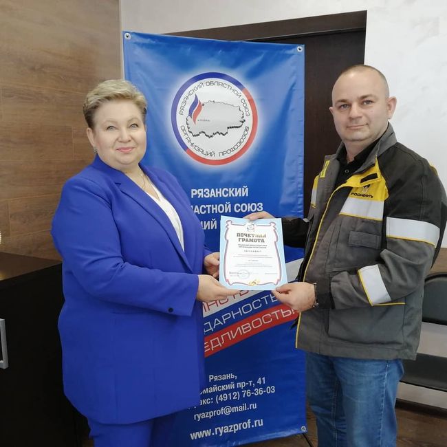На заседании Президиума Профобъединения председатель Рязанского областного Союза организаций профсоюзов Инна Калашникова вручила председателю ППО АО «РНПК» Александру Макарову Грамоту за победу в региональном конкурсе «Лучшая Первичная профсоюзная организация».