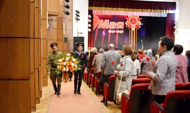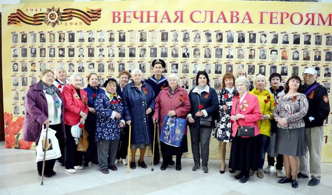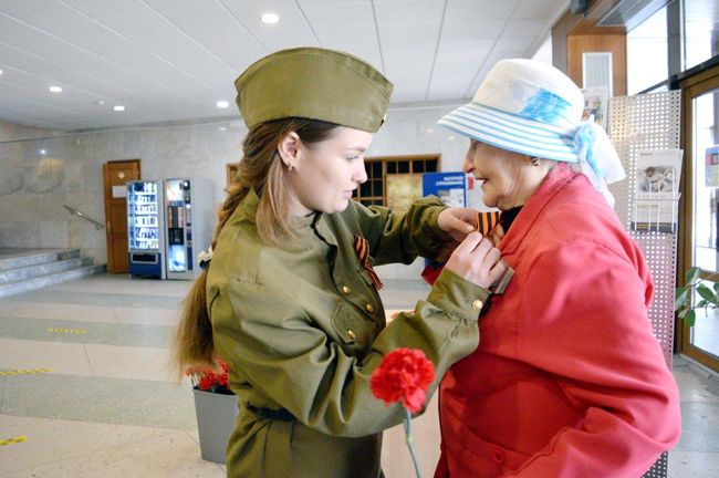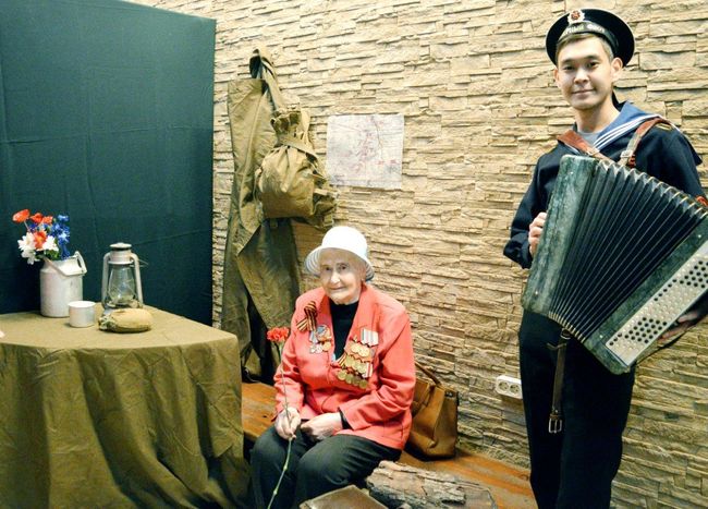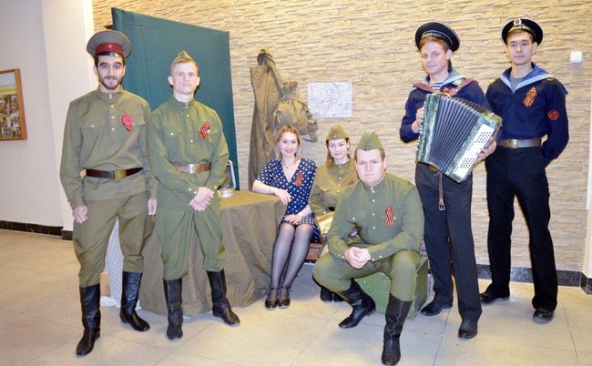 На входе во Дворце культуры их встречала профсоюзная молодежь, прикрепляла им георгиевские ленточки, дарила гвоздики. В фотозоне каждый желающий мог сфотографироваться в «Землянке», или в старой, военных времен, квартире. А молодые одетые в военную форму ребята с удовольствием фотографировались вместе с гостями.
